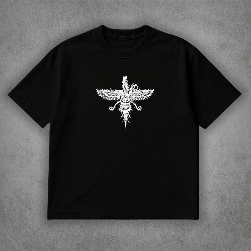 طرح این تیشرت برگرفته از نمادهای اصیل هخامنشی است؛ نمادهایی که ریشه در تاریخ و هنر ایران باستان دارند و صرفاً جنبه تزئینی ندارند. انتخاب این طرح‌ها با هدف حفظ اصالت انجام شده تا لباس، علاوه بر ظاهر، معنا و هویت مشخصی را منتقل کند. جزئیات طرح به‌گونه‌ای اجرا شده که خوانا، متعادل و هماهنگ با فرم تیشرت باشد و در استایل روزمره اغراق‌آمیز دیده نشود.