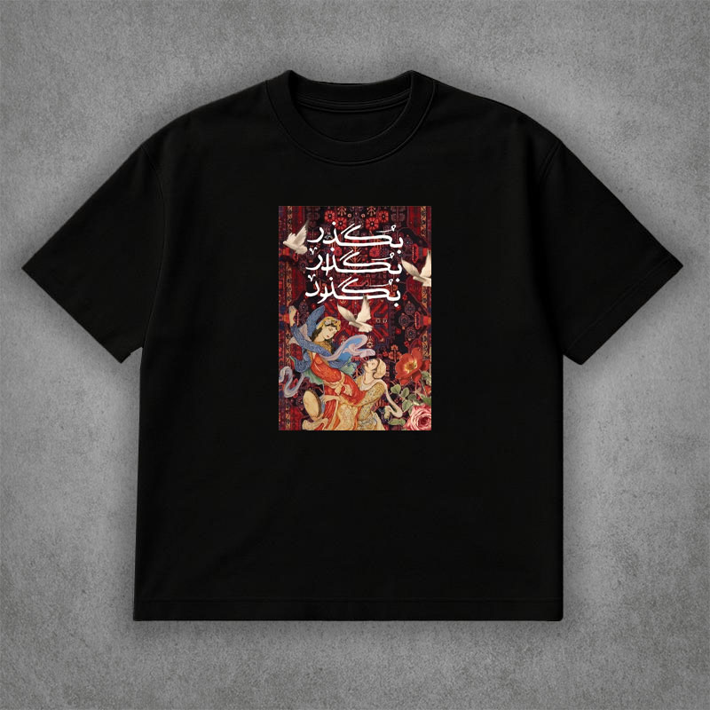 ین تیشرت سنتی برای کسانی طراحی شده که دوست دارند استایل روزمره‌شان فقط ساده نباشد و کمی معنا و شخصیت هم در آن دیده شود. طرح این مدل با الهام از عناصر هنر سنتی شکل گرفته؛ نقوشی که ریشه در خوشنویسی، الگوهای کلاسیک و فرم‌های آشنای فرهنگ بصری ما دارند و حالا در قالب یک تیشرت امروزی بازطراحی شده‌اند.